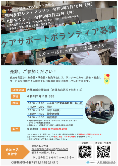 大阪府鍼灸師会では、令和8年1月18日(日)「河内長野シティマラソン」、2月22日(日)「大阪マラソン」にて、ケアサポートを行うスポーツボランティアを募集します。