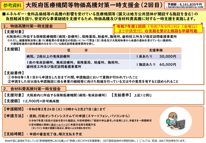 大阪府では、今年度2回目の大阪府医療機関等物価高騰対策一時支援金事業を実施することとしましたのでお知らせいたします。